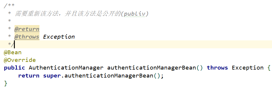 如果要将AuthenticationManager实例公开为bean,则需要重写public AuthenticationManager authenticationManagerBean()而不是protected AuthenticationManager authenticationManager()